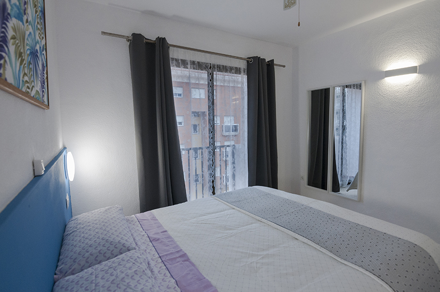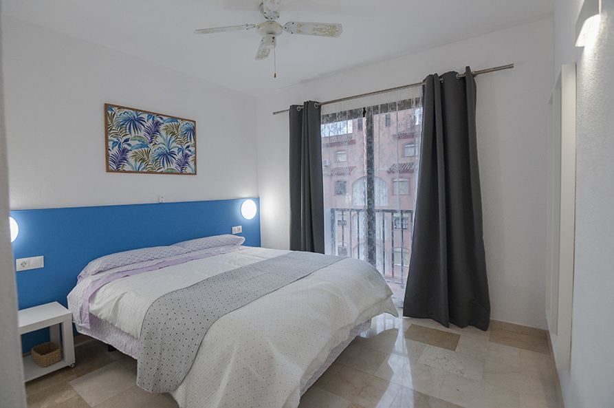 Det separata sovrummet med dubbelsäng är inrett i lugna toner och har även fransk balkong, vilket ger extra ljus och en trevlig atmosfär.