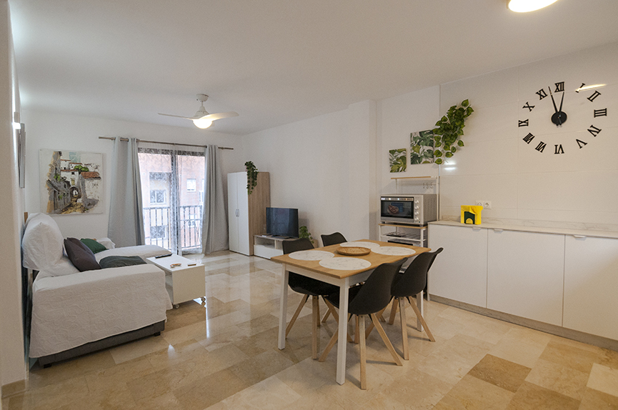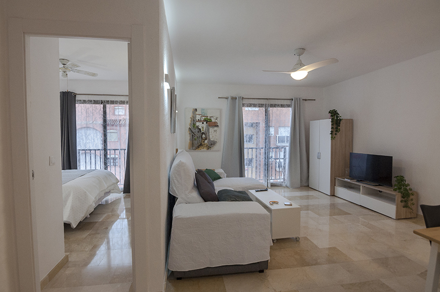 Vardagsrummet har en bekväm soffa, TV och tillgång till fransk balkong som fyller lägenheten med naturligt ljus.