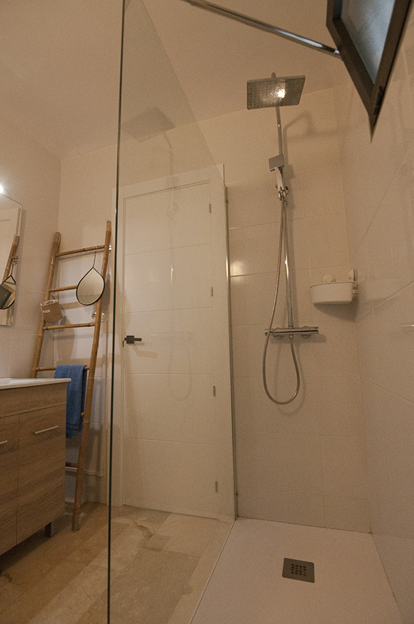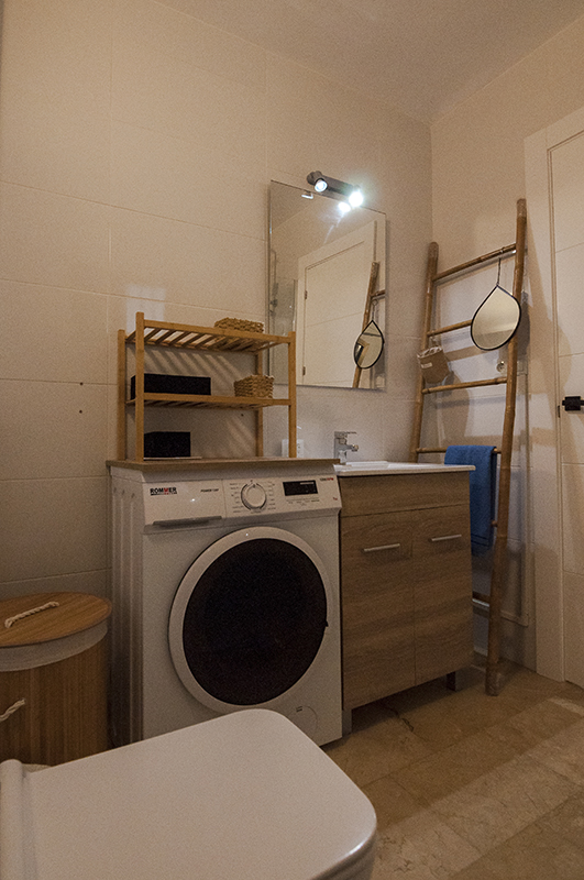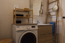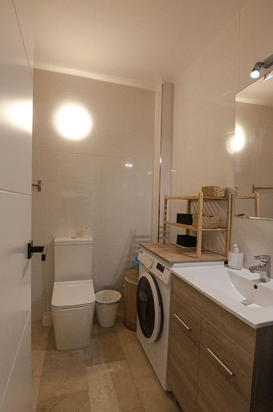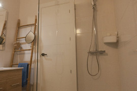 Lägenheten har ett funktionellt badrum med duschkabin och tvättmaskin.