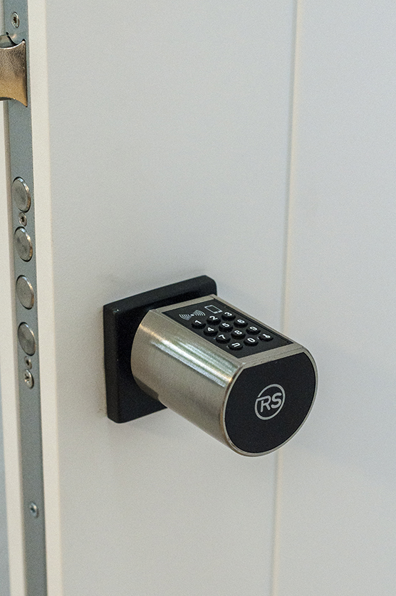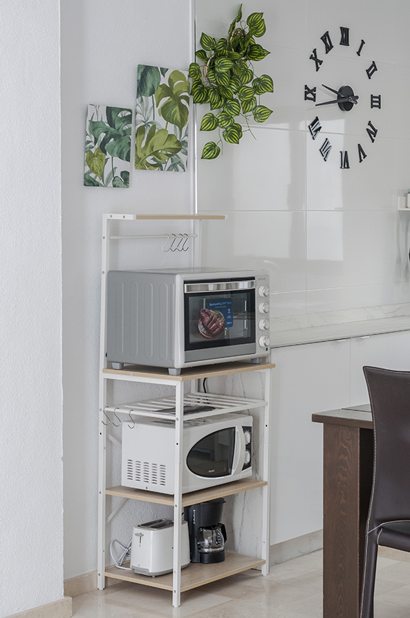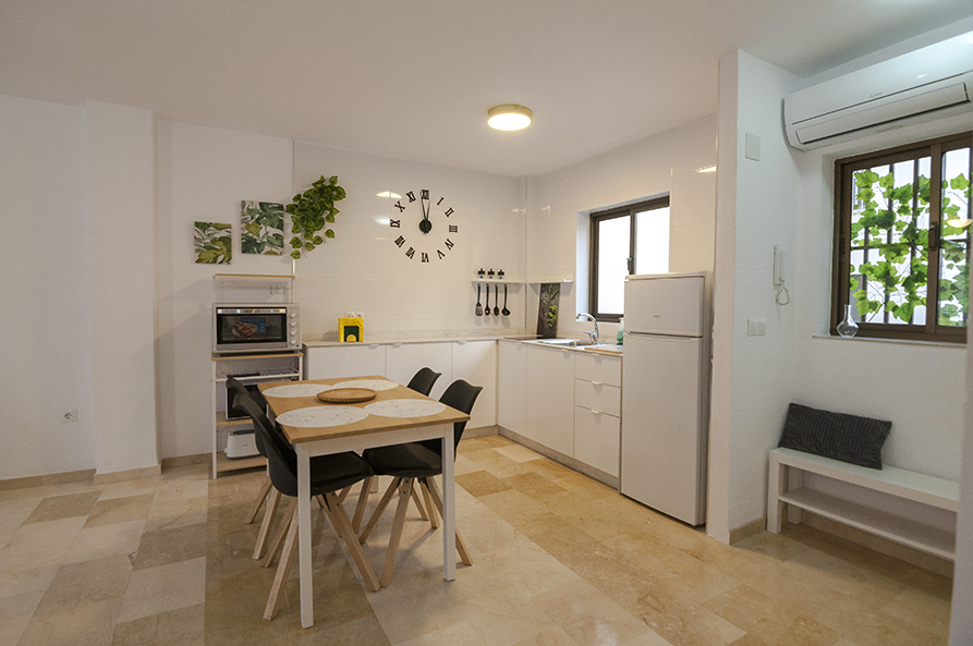 Det moderna köket är fullt utrustat med allt du behöver: kylskåp, spis, mikrovågsugn, kaffebryggare, brödrost och en komplett uppsättning köksredskap.